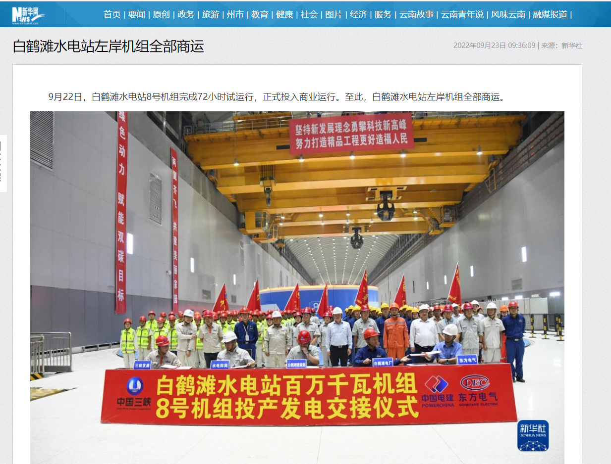 9月22日,白鹤滩水电站8号机组完成72小时试运行,正式投入商业运行。至此,白鹤滩水电站左岸机组所有商运。